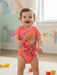 Short baby bodysuit for little girl with a lovely print. It is made in super soft cotton. The button closure between the legs makes it easy to put on and take off. It is very soft comfortable, and practical.