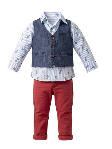 A special outfit made of cotton shirt with lovely vest in blue color, decorated with lovely buttons and a nice bow. The trousers are high quality J...