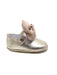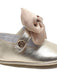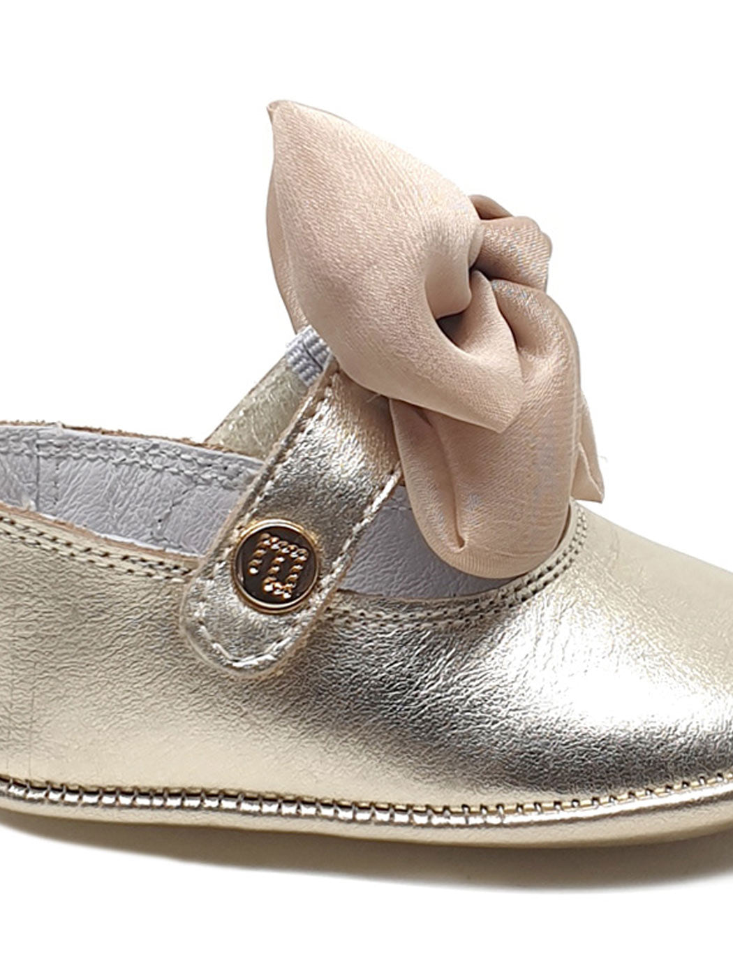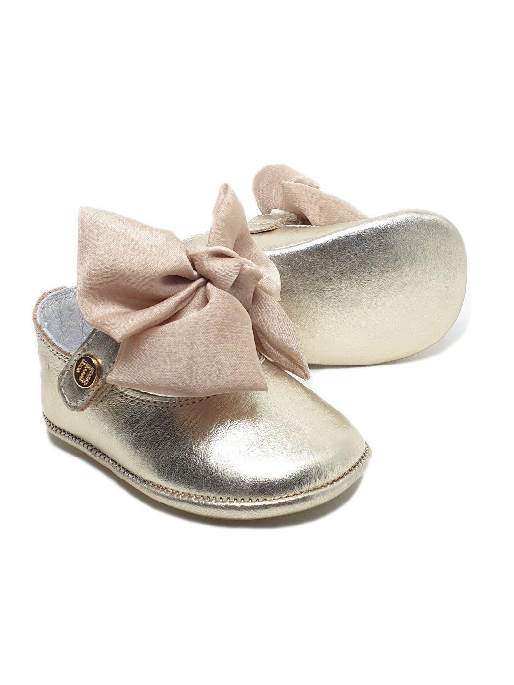 Elegant gold leather shoes for baby girls decorated with a lovely detachable bow that sits on the strap. They have a Velcro closure and an Andanines-branded gold-colored button. The shoes are made from gold leather and feature flexible outer soles, ideal for little feet. They have designed for any occasion and every day.