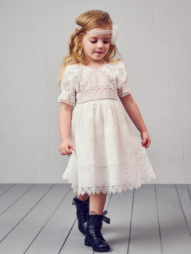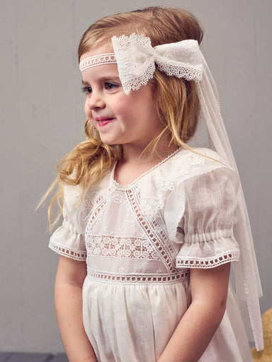 BABY GIRL CLOTHING A lace dress made of amazing French lace decorated with cotton trimmings. Long dots tulle sleeve, round neck, decorated with mat...