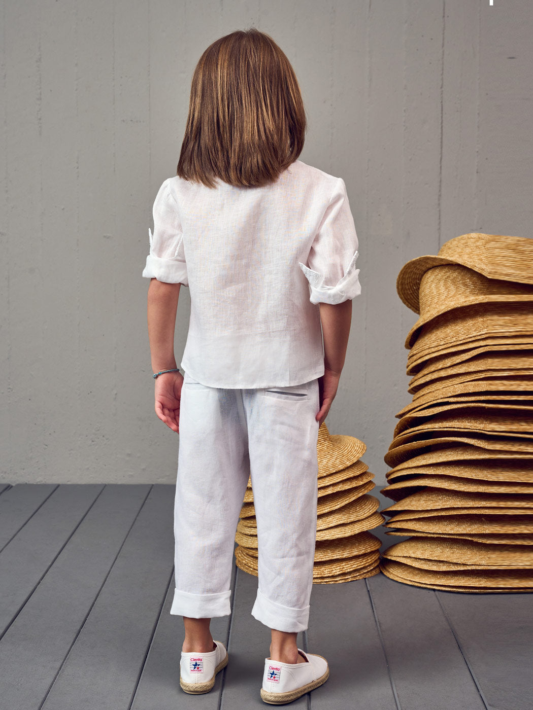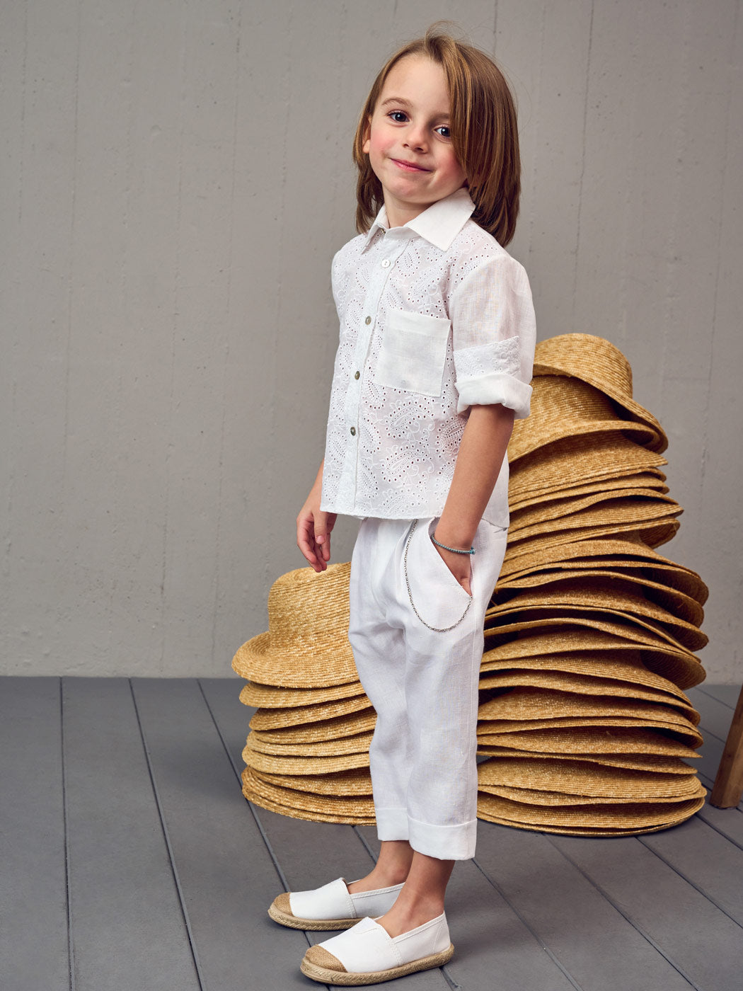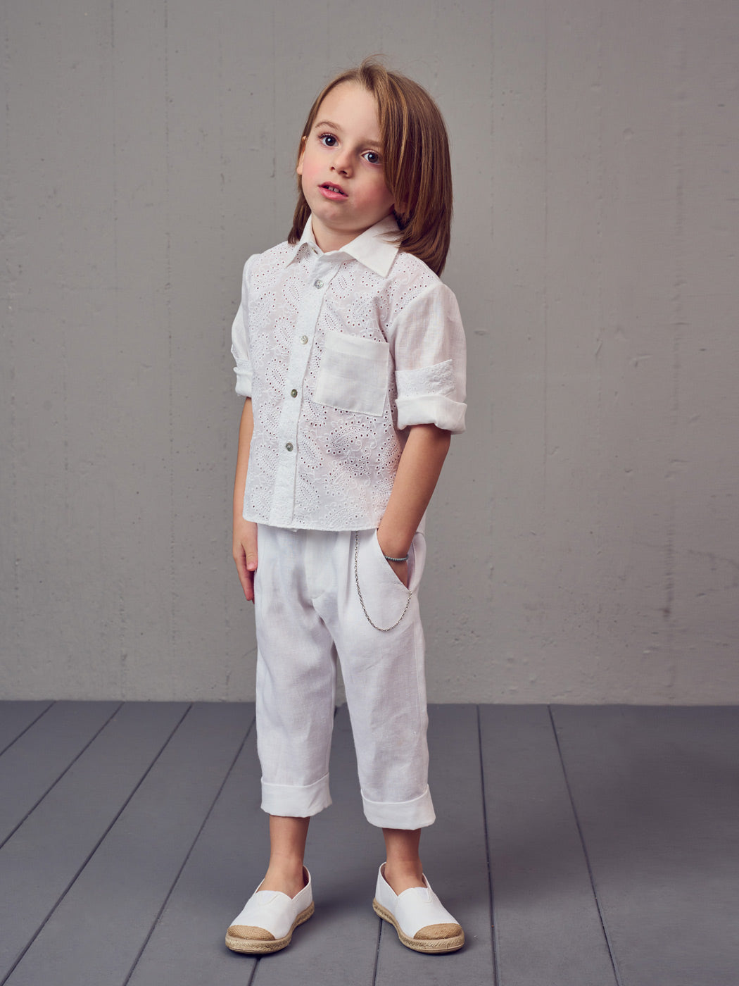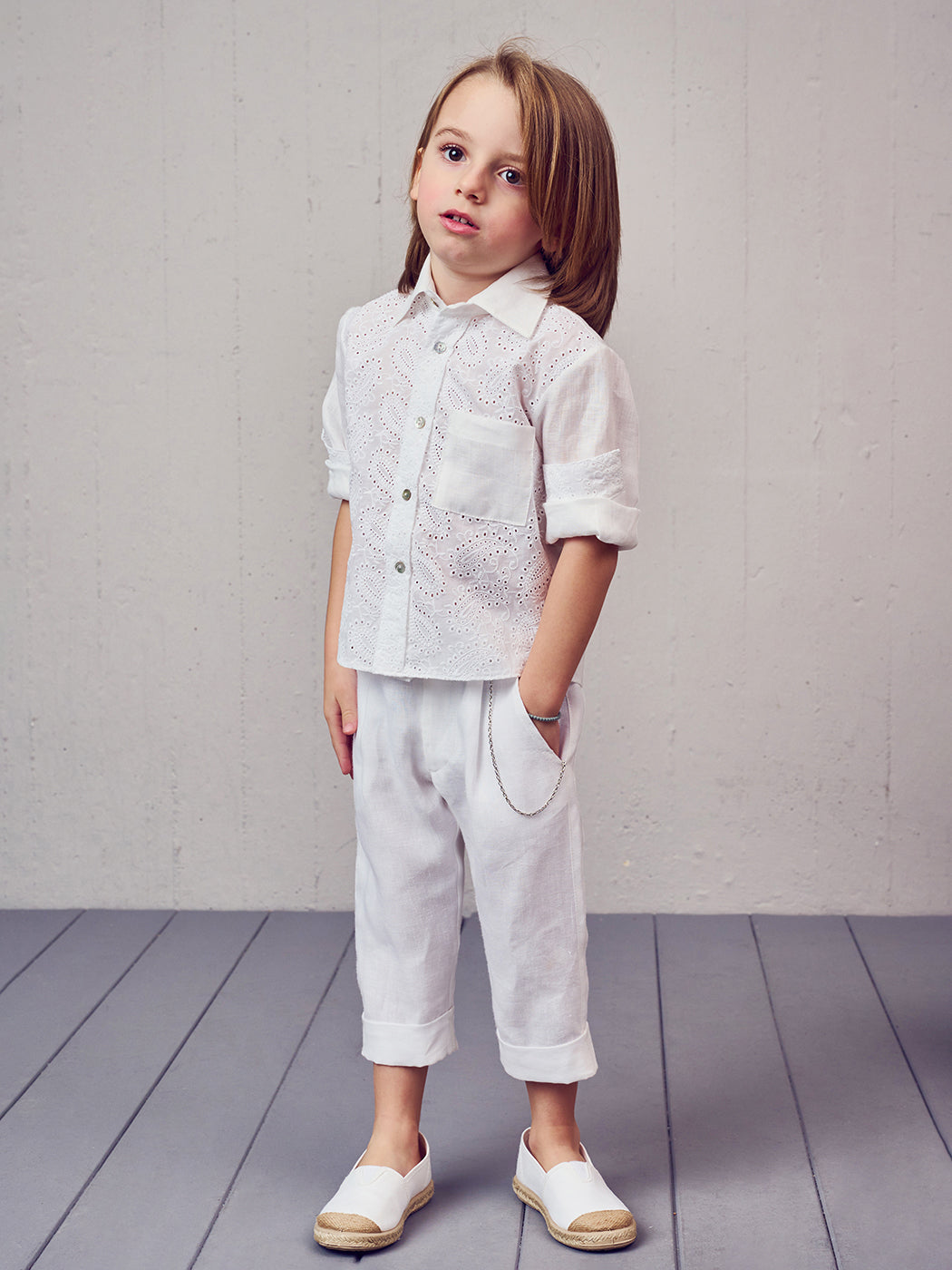 White Baptism set 3 pcs for boy. A light cool total for the summer. White Βoho shirt with chic lace, combined with comfortable linen pants