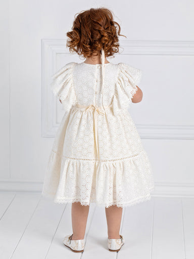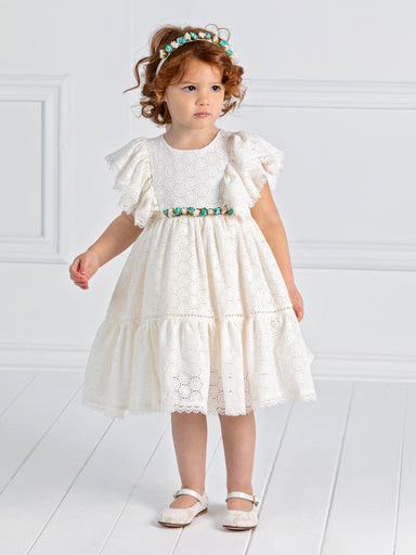GIRLS’ CEREMONY CLOTHING Classic dress made of silk fabric, with gathered wing sleeves, decorated with a lovely Guipure lace. Inner lining is 100% ...