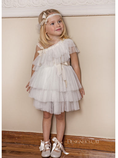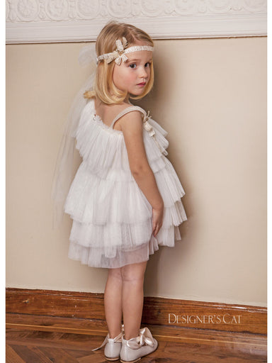 GIRLS’ CEREMONY CLOTHING Α stylish long tulle dress with V-neck, multi-layer skirt, cap sleeves and slanted ruffles. Inner lining is 100% soft cott...