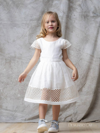 GIRLS’ CEREMONY CLOTHING A cute backless dress in “Broderie’ cotton lace, round neck and short sleeves. It is decorated with striped nervir cotton ...