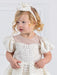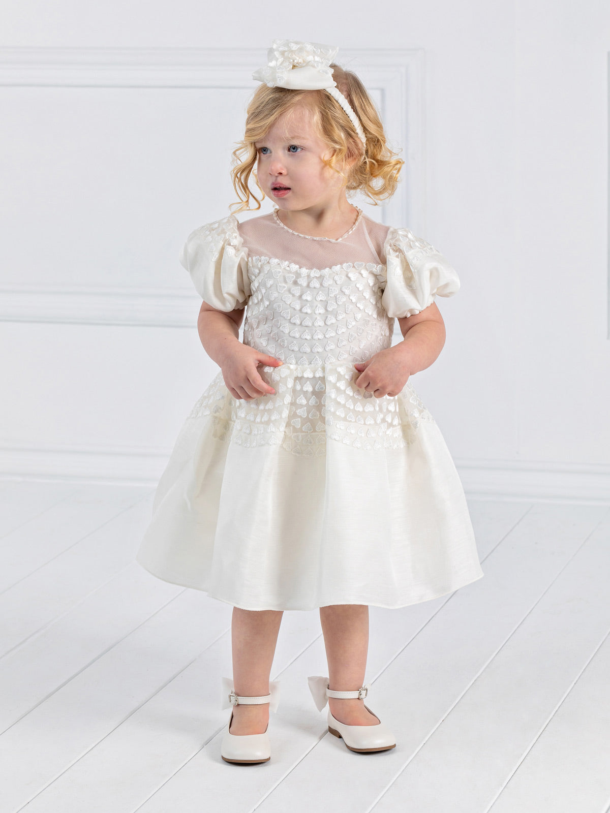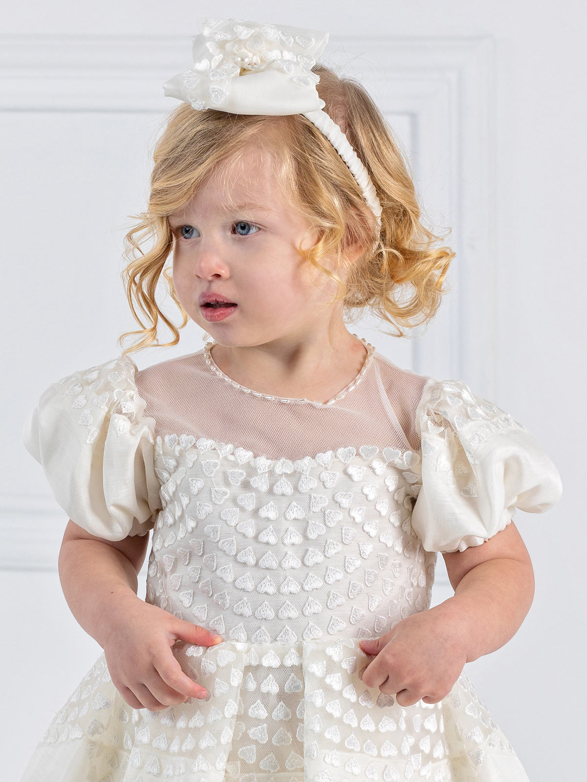 Impressive Christening silk dress made of fine embroidered tulle with lovely little motifs (hearts). Puff sleeve, round neck and inner lining 100% cotton. Off white color gives a plain yet classy touch to the outfit.