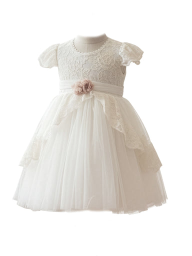 A Renaissance-style dress made of fine French lace on soft tulle. The belt matches with handmade vintage flowers. Inner lining is 100% cotton. A be...