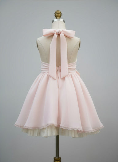 GIRLS’ CEREMONY CLOTHING Elegant Halter-neck dress with ties, made of excellent mixed fabric (linen, cotton, and silk), and cotton tulle bodice, de...