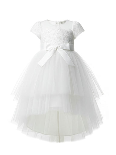 GIRLS’ CEREMONY CLOTHING Romantic sleeveless A-line dress, made of excellent lace and tulle, decorated with tulle maxi bow and flower at the back. ...