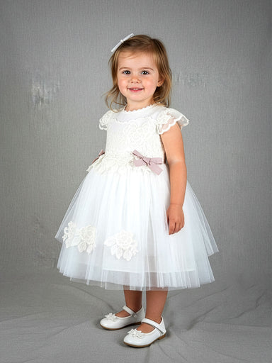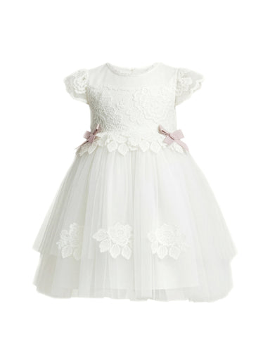 A Renaissance-style dress made of fine French lace on soft tulle. The bow in the back matches with handmade vintage flowers. Inner lining is 100% c...