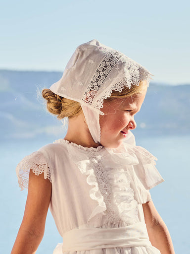GIRLS’ ACCESSORIES Handmade christening bonnet decorated with lace. AVAILABLE in one size for babies from 6 to 24 months