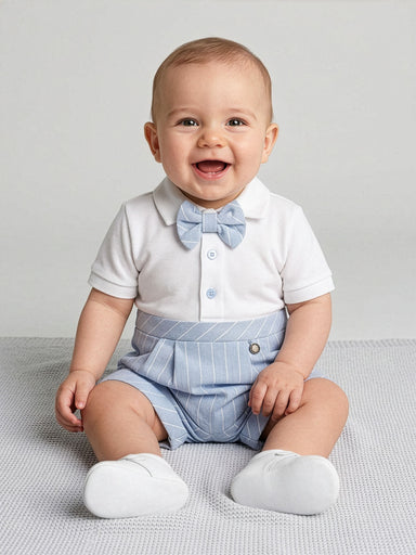 BOY CEREMONY CLOTHING - NEWBORN Minimalist suit for little boy consisting pinstripe effect shorts, with elasticated waist and blouse with collar an...