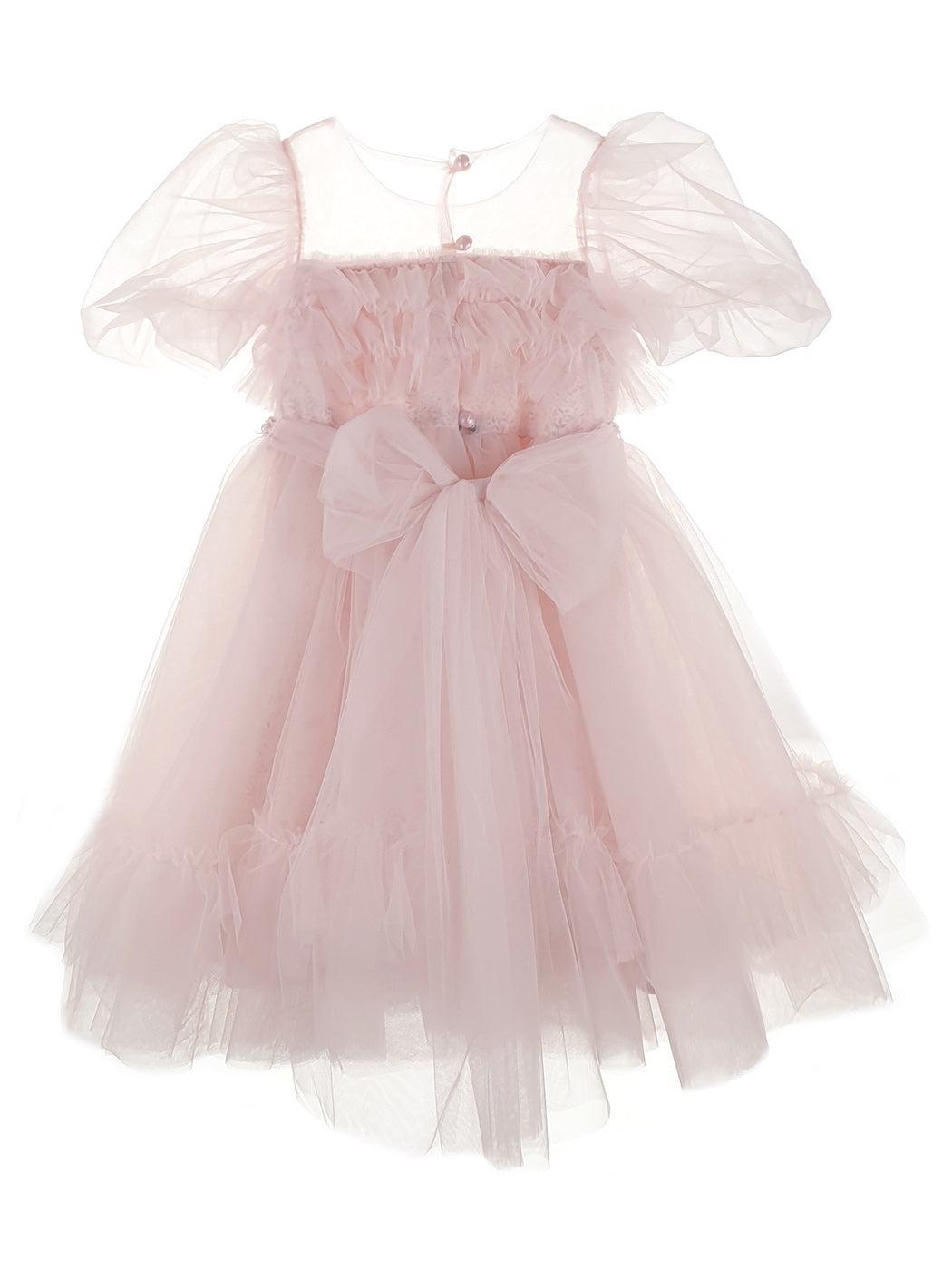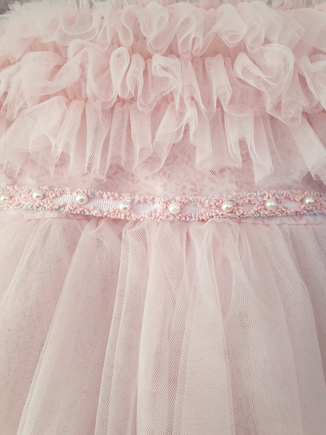 Romantic dress in baby pink color, made of Silk-touch tulle, with lovely Gigot sleeve, ruffles on the bust and the end of the skirt. It is decorated with a beautiful belt of pearls. Inner lining is 100% cotton. A stylish dress for special occasions.