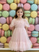 Romantic dress in baby pink color, made of Silk-touch tulle, with lovely Gigot sleeve, ruffles on the bust and the end of the skirt. It is decorated with a beautiful belt of pearls. Inner lining is 100% cotton. A stylish dress for special occasions.