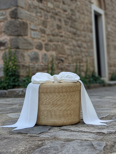 Elegant handmade baptism basket with lid, made of 100% natural wheat, decorated with nice maxi bow of silk with embroidered. The baptism basket bag...