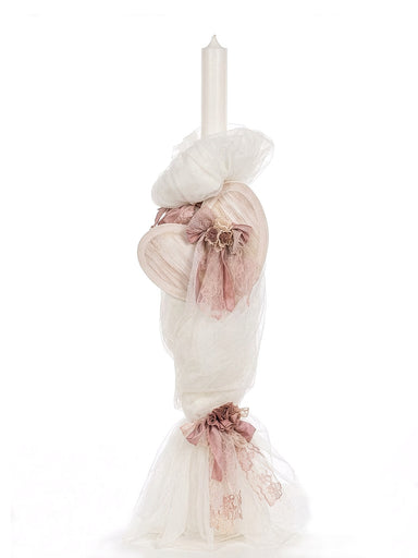 Candle knit with silk pink fabric and lace Kippur. Decorated with handmade silk flowers matching the corresponding dress series.