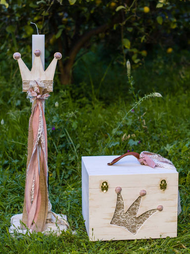 Christening candle, made of tulle and lace. It is decorated with accessories from natural birch wood (heart theme) . It is combined with the matchi...