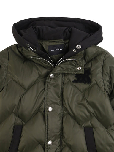 GIRLS' CLOTHES - John Richmond Junior Trendy quilted short padded down jacket with hood, wide neck, off-center front zip fastening and detachable a...