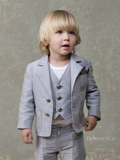 BOYS’ CEREMONY Modern striped linen summer jacket with Mao collar by Designer's Cat. Trendy choice for our little gentlemen, which is combined with...