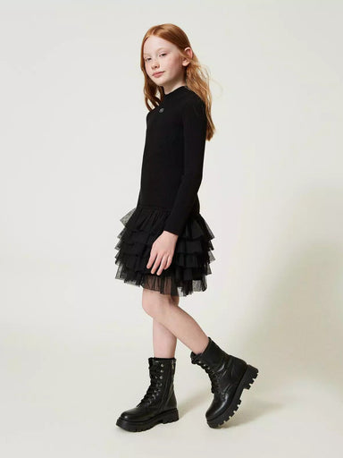 Twinset Girl's Clothing Girls' short pleated knit dress with Lurex yarn in straight fit, made of viscose blend. Round neck, long sleeves and Oval T...
