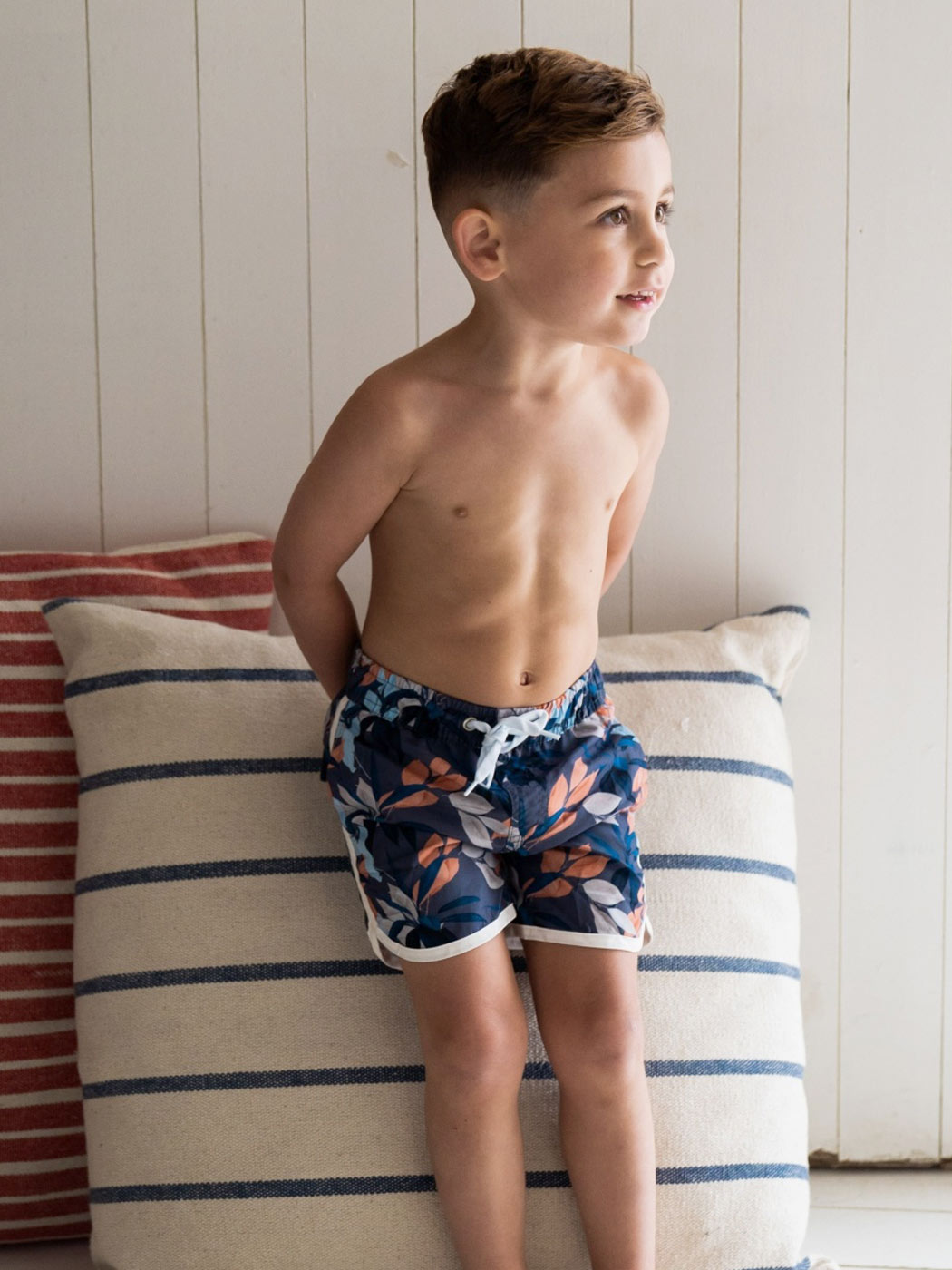 Boys swimming shorts dark grey flower. Swimming shorts with print, made of a supple material which wears comfortably.