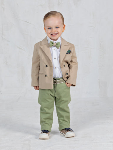 BABY CLOTHING Classic suit for little boys, made of cotton fabric in regular line. The total consisting of trousers, jacket, shirt and bow tie. The...