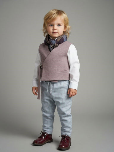 BABY CLOTHING Elegant christening outfit for little boys, made of yarn dyeing cotton fabric with special style vest stitching. This 5-piece set (ve...
