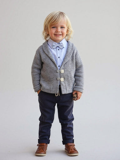 BABY CLOTHING Trendy total for little boys, consisting of velvet cotton pants, cotton shirt, mixed wool knitted cardigan, bow tie and hat. A perfec...