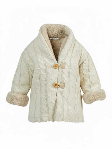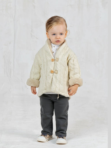 BABY CLOTHING Modern knitted wool cardigan in cream color with faux fur inside, decorated with impressive buttons. It’s very comfortable and pract...