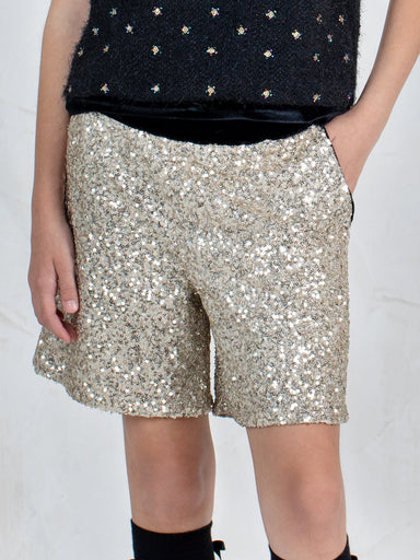 GIRLS' CLOTHING Impressive shorts for girl decorated with sequin in gold color and velour details. Inner lining is 100% cotton. It can also be comb...