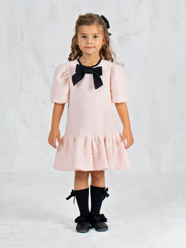 GIRLS’ CLOTHING Elegant jacquard dress with Chanel-style ruffles, from viscose and cotton, with round neckline, puffed sleeves and ruffles on the s...