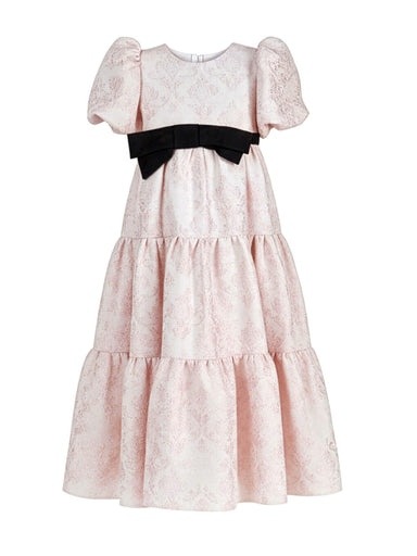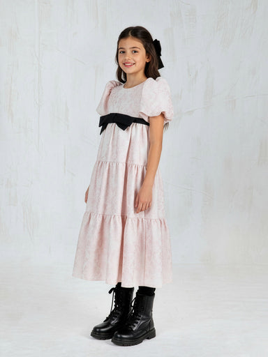 GIRLS’ CLOTHING Elegant brocade dress with round neckline, short gigot sleeves and ruffled skirt. It is decorated with lovely black belt-bow. A per...