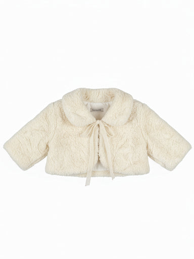 Ecological bolero for little girl made of soft faux fur with sleeve, decorated with lace trimmings. Inner lining is 100% cotton. It matches perfect...