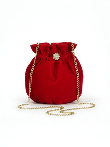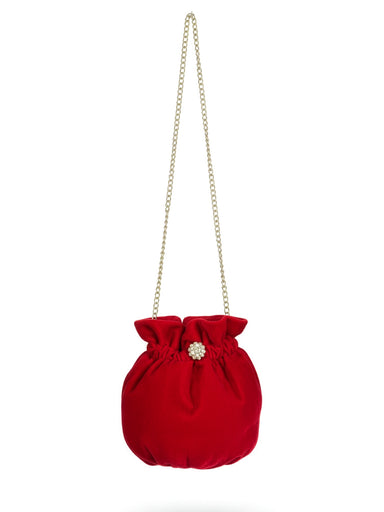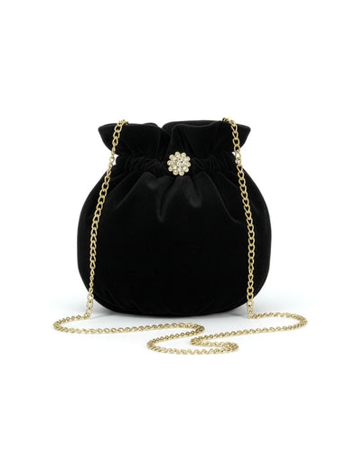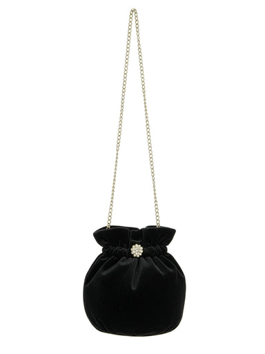 GIRL ACCESSORIES Trendy velvet bucket bag, with shoulder chain and magnet button closure. It is decorated with crystal stone jewel. This mini bag i...