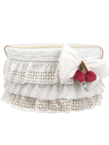 Oval baptism box made of elegant embroidered cloth, decorated with ruffle and “JELLYCAT soft toys. It is combined with the matching baptism dress f...