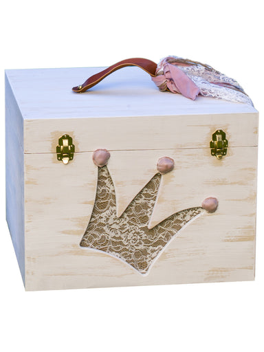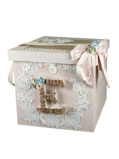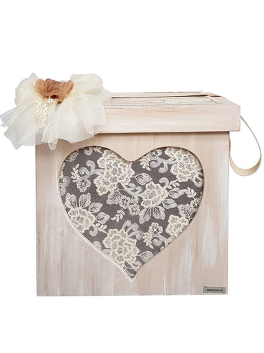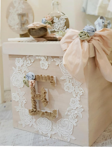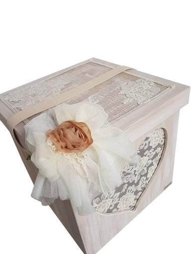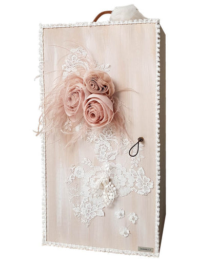 Handmade box(cube) from birch wood with cotton strap and brass fittings. It is decorated with handmade theme (monogram) made of lace and handmade s...