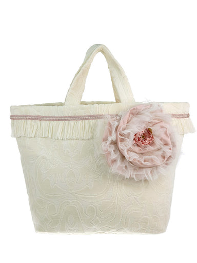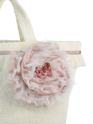 Handmade cotton velvet bag decorated with fringes and silk flowers. Combined with a range of dresses and accessories christening collection of DESI...