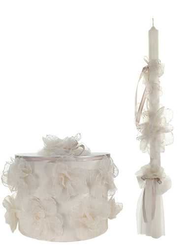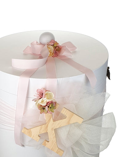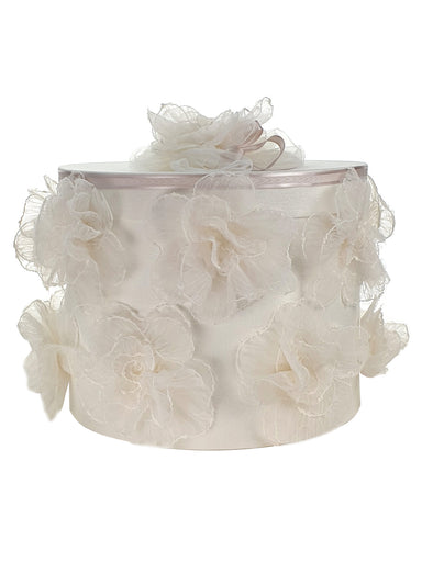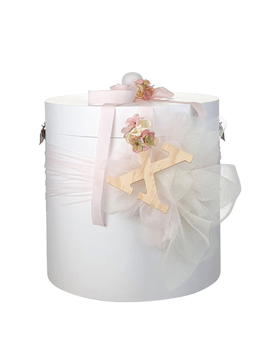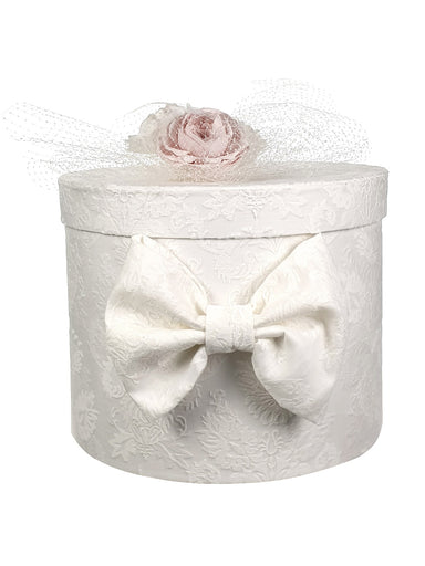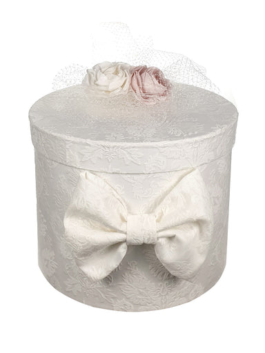 GIRLS' CHRISTENING ACCESSORIES Round christening box decorated with jacquard linen fabric, veil and decorative handmade flowers. A perfect choice f...