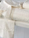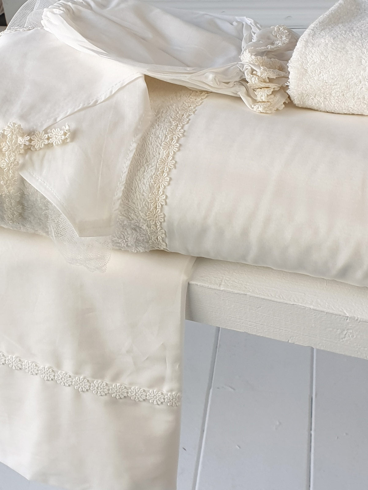 Christening underwear set 6 pieces, including 2 excellent quality fluffy towels (100% Egyptian combed cotton 600gr/m2), 1 sheet and 3 pieces of underwear. The towel is decorated with the same trimmings and cotton border giving the set a touch of elegance.