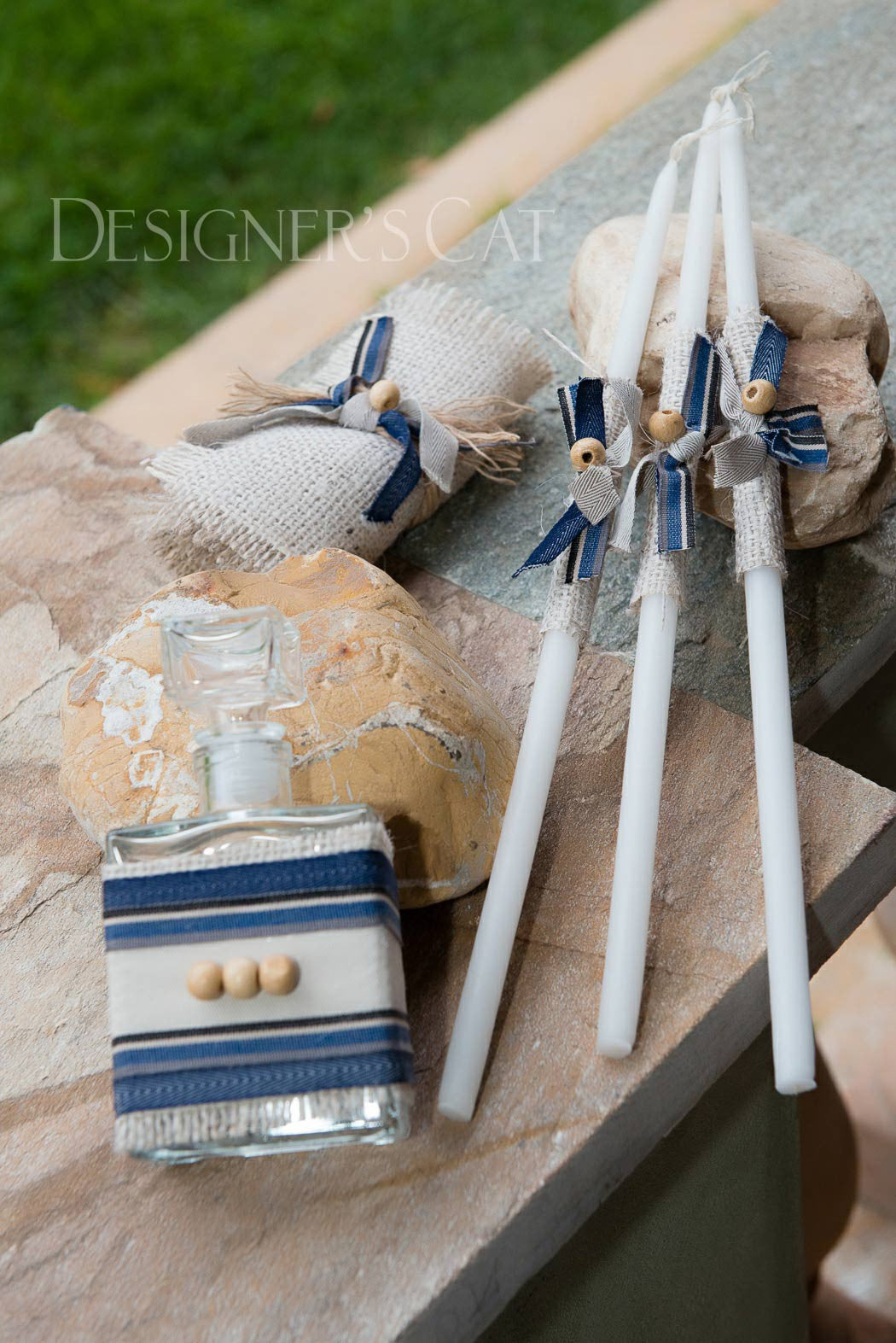 Oil kit 5 pcs. (candles, scented soap, bottle) decorated with fabrics and materials combined with the corresponding christening outfit.