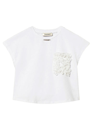 Twinset Girl's Clothing-261GJ2Q63 Girls' stretch cotton jersey T-shirt with patch pocket decorated with roses. Crew neck, metal logo plate, short w...