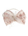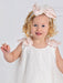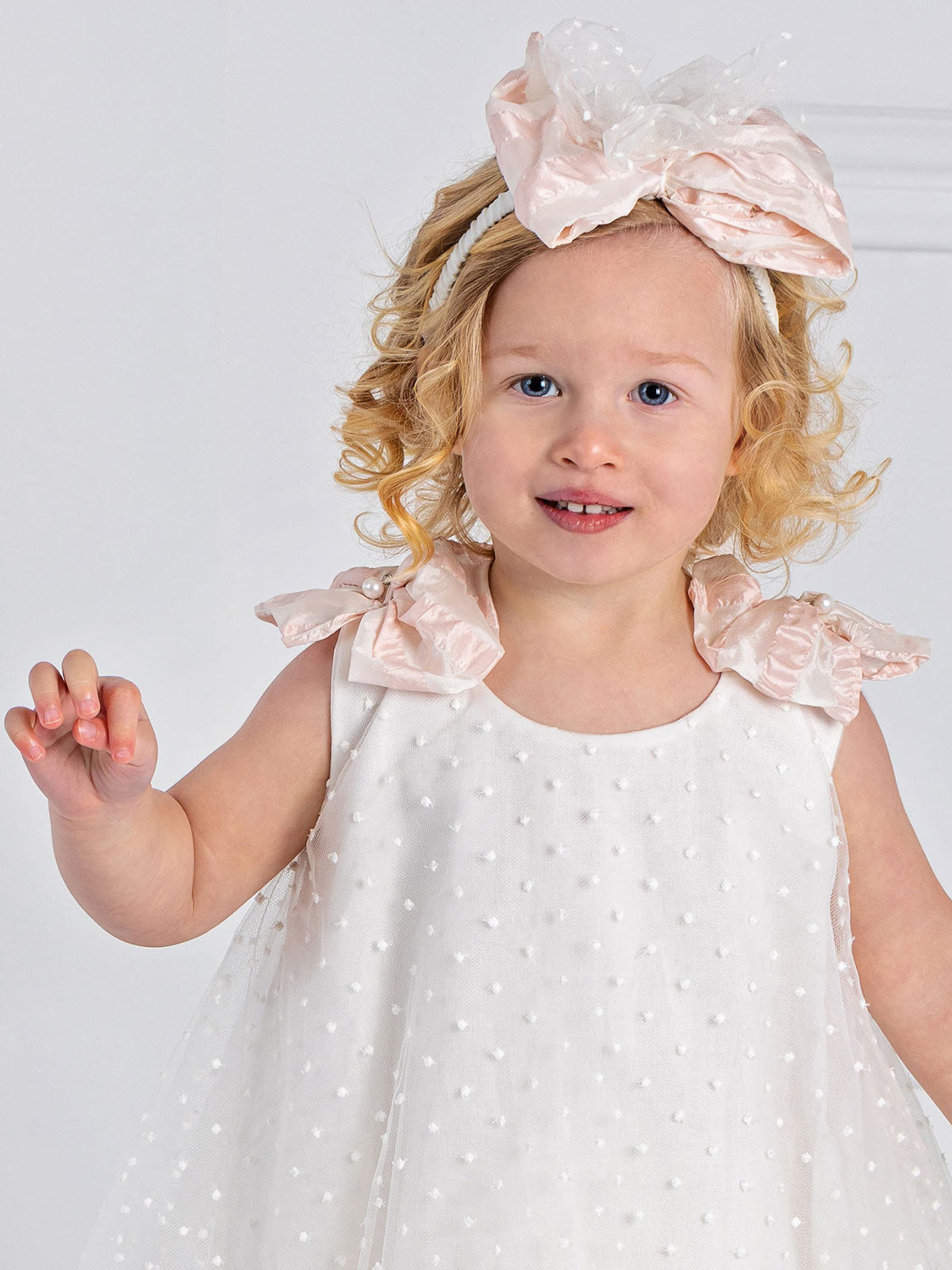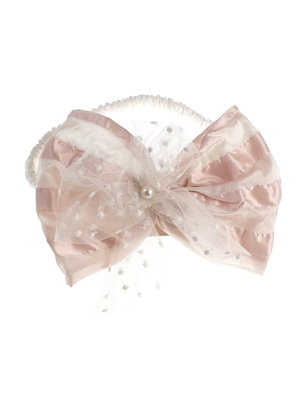 Κομψή κορδέλα μαλλιών για κορίτσι, "Φιόγκος " από μεταξωτό ύφασμα διακοσμημένη με κεντημένο τούλι και πέρλες. Μπορεί να συνδυαστεί με το ασορτί φόρεμα από τη συλλογή Designer's Cat. Αντιστοιχεί σε ηλικίες από 6 μηνών έως 10 ετών.Ιδανική και κομψή επιλογή για ειδικές εκδηλώσεις όπως η βάπτιση και ο γάμος.