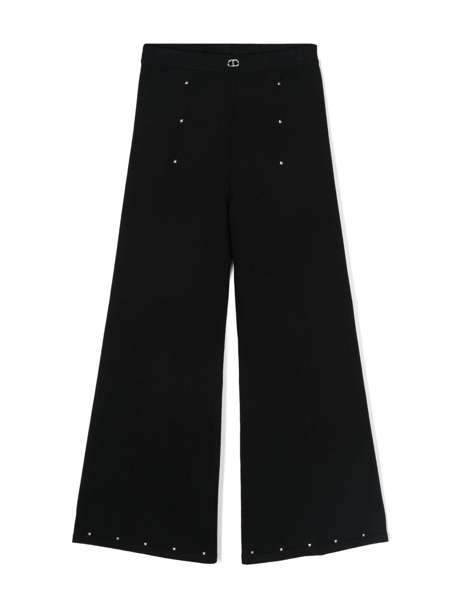 Κοριτσίστικο πλεκτό παντελόνι με ραβδώσεις διακοσμημένο με λεπτομέρειες από καρφάκια σε ασημί τόνο, ελαστική μέση και φαρδύ στα πόδια. Είναι άνετο, πολύ απαλό και πρακτικό. Ιδανική επιλογή για μια ξεχωριστή εκδήλωση αλλά και για κάθε μέρα.