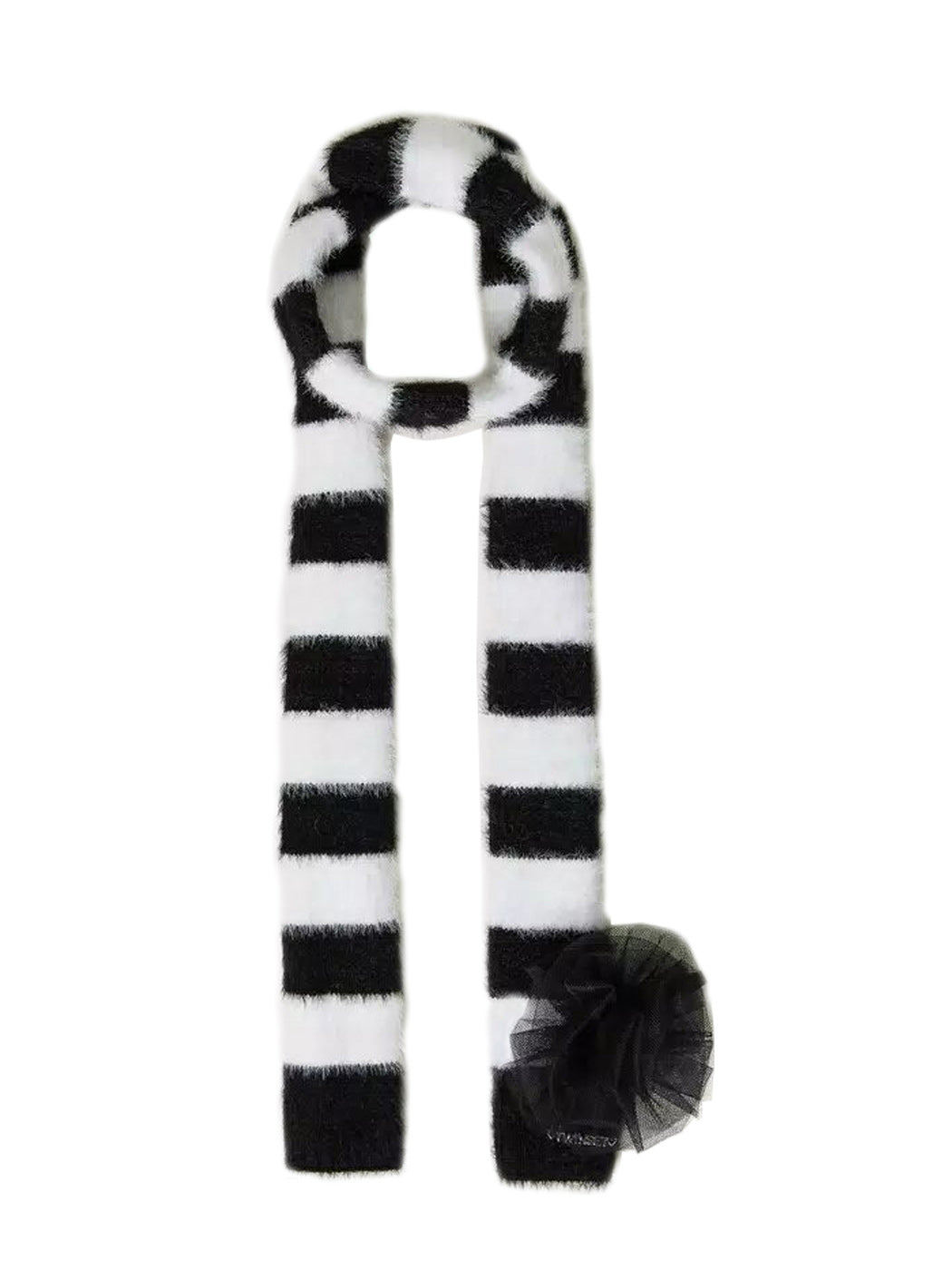 Δίχρωμο ριγέ κασκόλ από αφράτο πλεκτό, με καρφίτσα από τούλι και λογότυπο με γράμματα. Απαλή, ζεστή αίσθηση που ταιριάζει με όλα τα εξωτερικά της ρούχα και συνδυαζεται ιδανικά με ασορτί σκουφάκι.