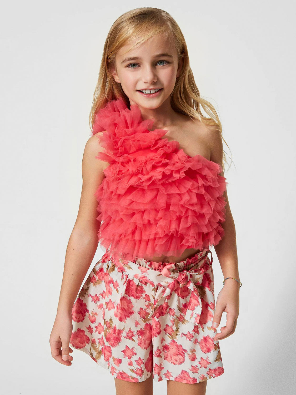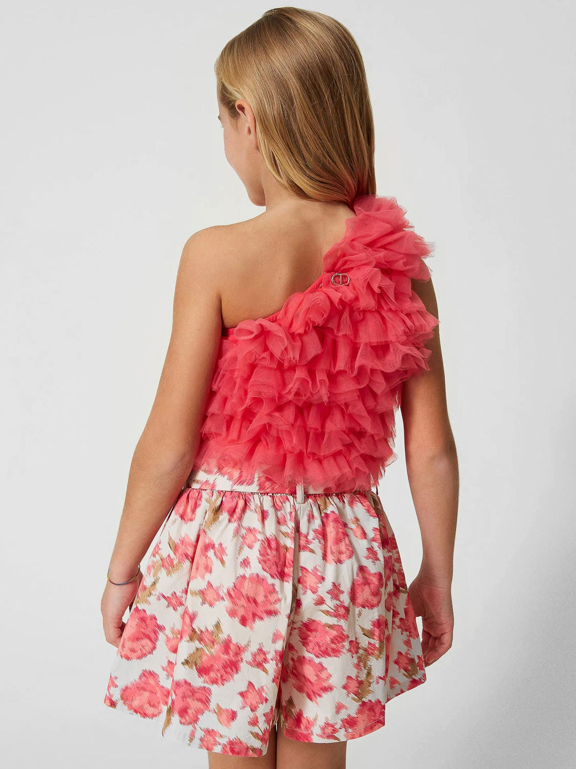 Ρομαντικό μπλουζάκι με έναν ώμο για κορίτσια από μαζεμένο τούλι με φόδρα από βαμβακερό ζέρσεϊ. Είναι μια τέλεια επιλογή συνδυάζοντας το με φούστα ή παντελόνι.