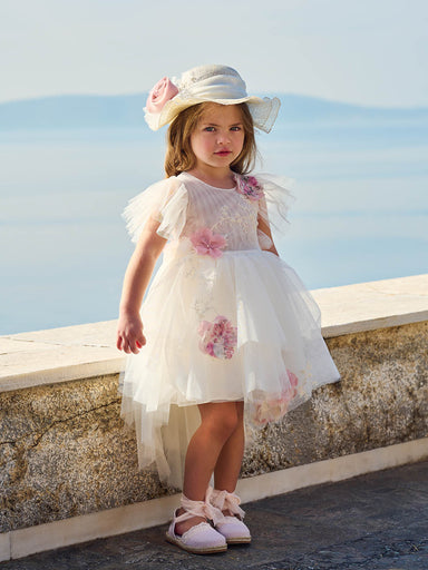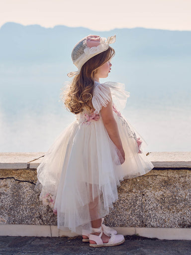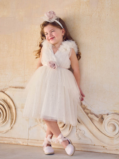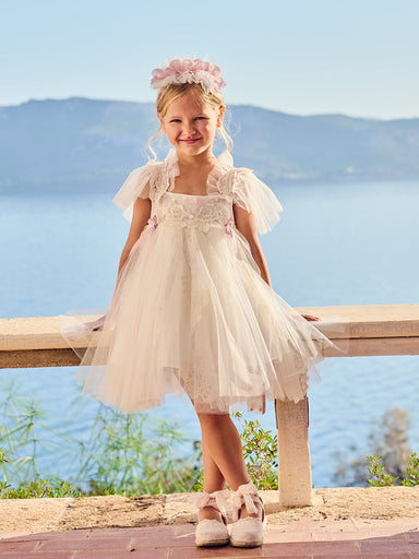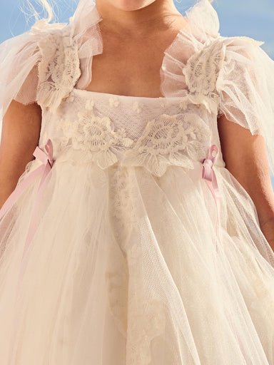ΕΝΔΥΣΗ ΓΙΑ ΚΟΡΙΤΣΙ – ΒΑΠΤΙΣΗ Αμάνικο φόρεμα από τούλι με κεντημένο πουα, στρογγυλή λαιμό κόψη, V πλάτη, διακοσμημένο με λουλούδια και φτερά στη μέσ...