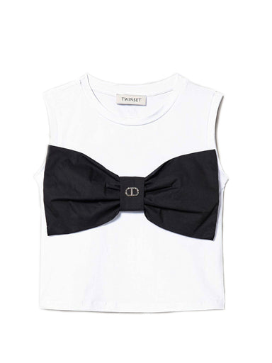 ΕΝΔΥΣΗ ΓΙΑ ΚΟΡΙΤΣΙΑ. Twinset λευκό ελαστικό βαμβακερό αμάνικο μπλουζάκι με αφαιρούμενο φιόγκο από ποπλίνα με μεταλλικό λογότυπο Oval T. Κωδ. BRAND:...