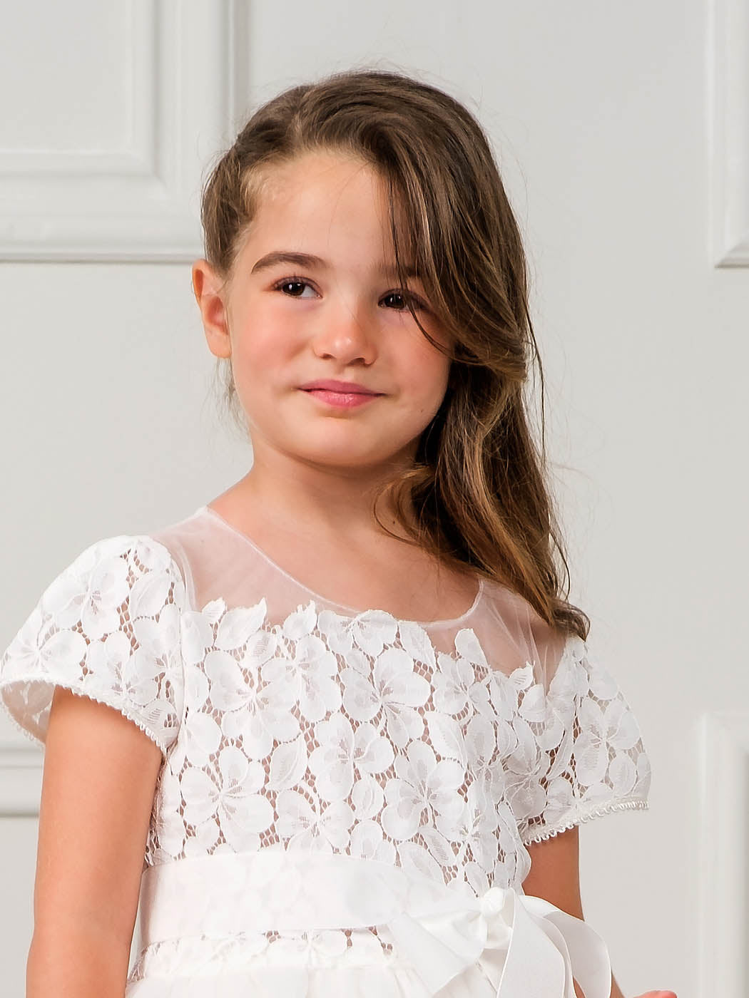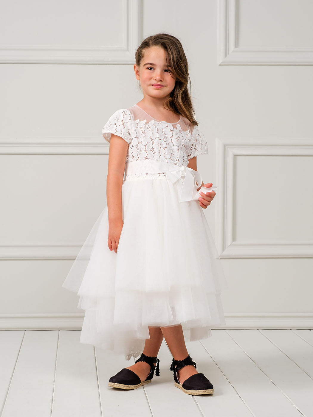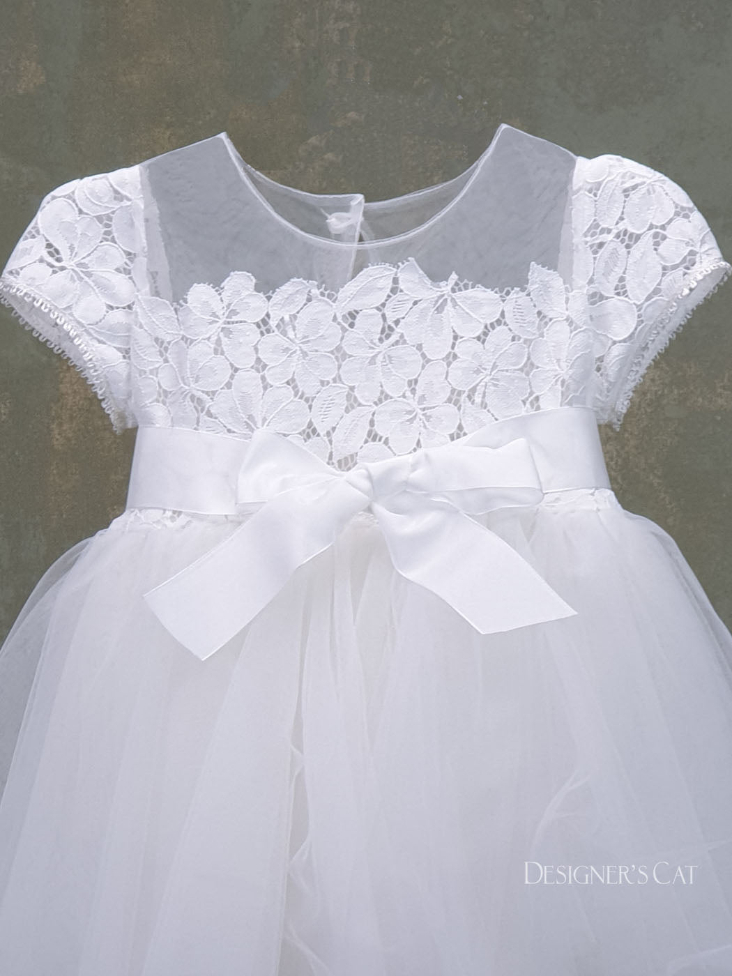 Φόρεμα vintage από εξαιρετικό τούλι και γαλλική δαντέλα στο μπούστο και τα τελειώματα. Διακοσμημένο με ένα υπέροχο χειροποίητο satin φιόγκο. Εσωτερικά είναι επενδυμένο με ύφασμα 100% βαμβάκι. Ένα μοναδικό σύνολο για αέρινες εμφανίσεις. Συνδυάζεται άψογα με αντίστοιχο μπολερό και παπούτσια της συλλογής "Designer’s Cat Shoes". Διατίθεται σε μεγέθη από 1 έως 12 ετών σε χρώμα off white