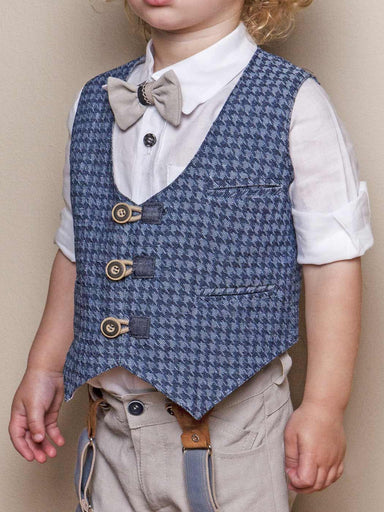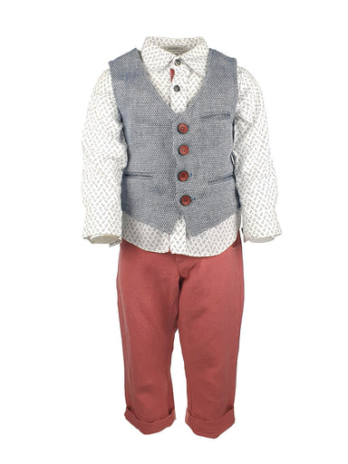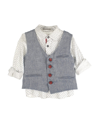 Ιταλική φινέτσα με ιδιαίτερες λεπτομέρειες σε ένα σύνολο που αποτελείται από βαμβακερό γιλέκο στολισμένο με υπέροχα κουμπιά FRATUS και παντελόνι σ...