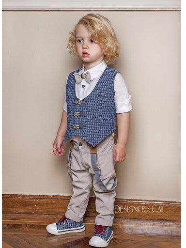 ΕΝΔΥΣΗ ΓΙΑ ΑΓΟΡΙ - ΒΑΠΤΙΣΗ Designer’s Cat- Μοντέρνο βαπτιστικό σύνολο για αγόρι σετ 5 τεμαχίων, που αποτελείται από βαμβακερό παντελόνι και ασύμμετ...