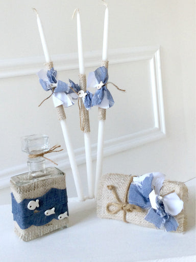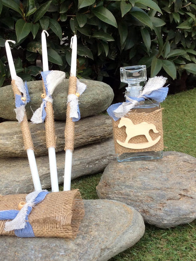 Baptism set Oil for boy 5 pieces (1 oil bottle, 3 candles and 1 scented soap bar), decorated with fabrics and materials from the matching baptism o...